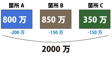 例えば箇所A、箇所B、箇所Cの3箇所を直すとして、オーソドックスに工事をしていたら2500万円かかりそうだとします。↓